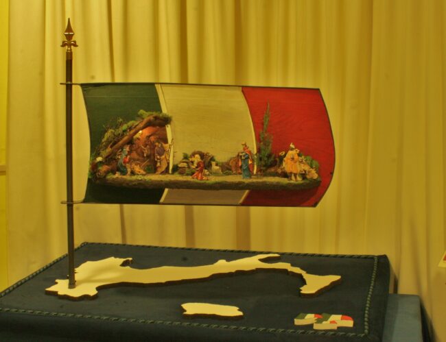 Sulla base c’è l’Italia e da Torino che nel 1861 divenne prima Capitale del Regno d’Italia, si innalza l’asta che regge la bandiera tricolore dalla quale esce la Natività nel segno dell’Unità.